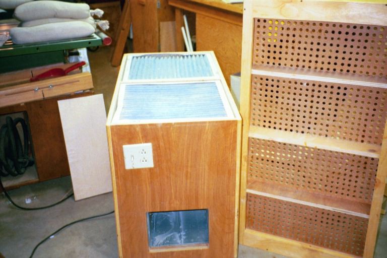 The next photo shows the unit with the top removed (top removed.jpeg). You can see the furnace filters in place, and the cross braces for the perforated top. Also, the rim around the perf top was sized so I could get a full 2' x 4' surface, and still build the box enclosure with only one sheet of plywood. The filters are 1" thick, and I stack two on top of each other to give a 2"filter. Much cheaper.