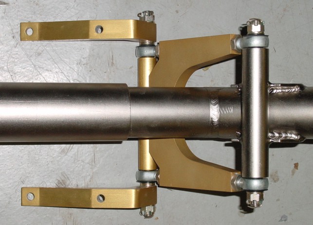 I thought you might like to see a picture of a modification I did (under Vance's recommendation) to the castoring nose gear "H" bracket. I have converted the plain aluminum pivot points to rod end bearings.