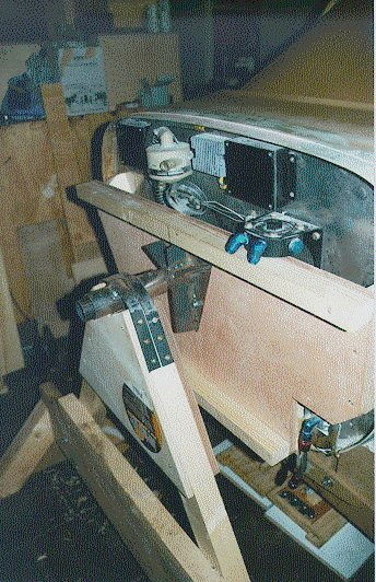 The firewall attachment consists of a couple of bits of 2 x 2 bolted to the engine mounting points and then a 1/2" sheet of cheap plywood glued and screwed on . The mechanism is a tube welded to a plate which is bolted to the plywood approximately lining up with the centre of the firewall .