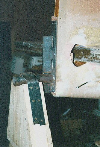 The jig was made around the Keep it Simple technology , and uses 2 of the original 3 support frames that we all built early on to support the fuselage bottom during its construction. Onto each of these are bolted a simple "A" frame made again from 2x 2 and a bit of ply with a tube strapped and welded on the tops The rear "A"frame must be high enough to allow the verticle stabilizer to clear the floor at all times .