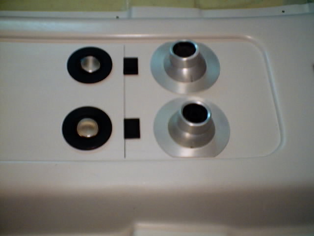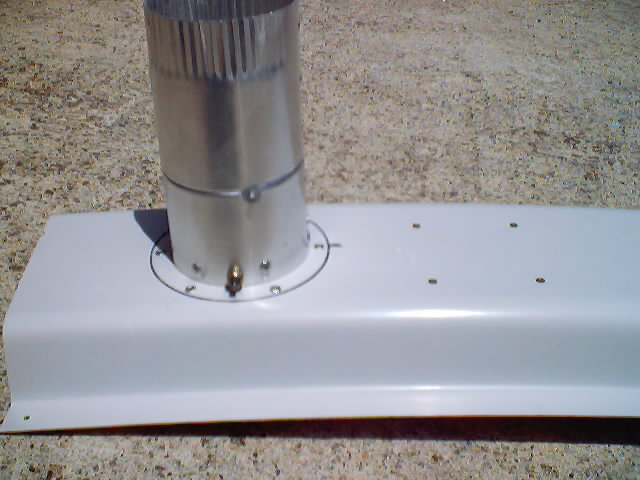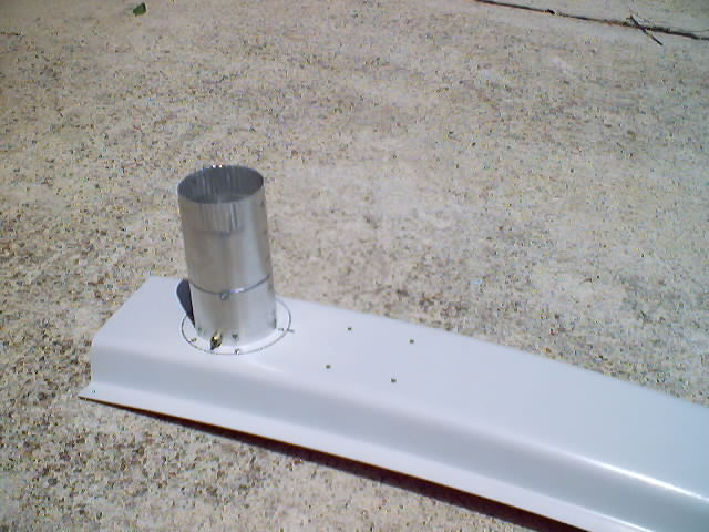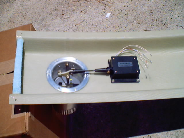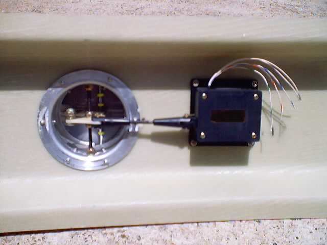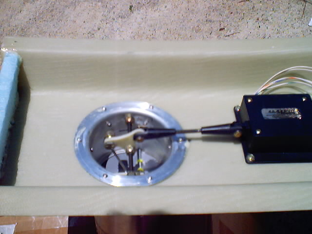 | The tube is attached by pop rivets to a 3" aluminum flange I obtained from Aircraft Spruce. The flange is mounted from the inside of the console with pop rivets as well. I placed a second pivot shaft for mounting a pivot control arm as near the opening to the console as possible. I used the scrap from the servo control arm to fabricate this shaft. I constructed a control arm from scrap 1/8" glass scrap and mounted it on the shaft. It is locked in place by self locking nuts on either side which results in the whole shaft turning instead of the arm wearing on the threaded shaft. I used self locking nuts and washers on both the inside and outside to keep everything snug and tight while still giving free rotation. The servo was a spare which I bought at the flymarket at Oshkosh. | |