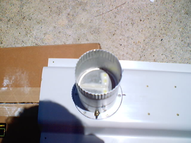 | The photos above and below show the connection of an aluminum tube (3") to the console which contains the valve for closing off the air from the inlet in the vertical stabilizer. I used a very inexpensive damper valve that I obtained from McMaster-Carr. The original unit had a free floating one way valve which I replaced with one I fabricated from some scrap left over from the instrument panel. I fabricated a control horn on it for attaching a stiff wire to use in opening and closing the valve. I used the shaft from the original flapper valve and bonded it into place once installed to provide the pivot point. | |
