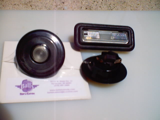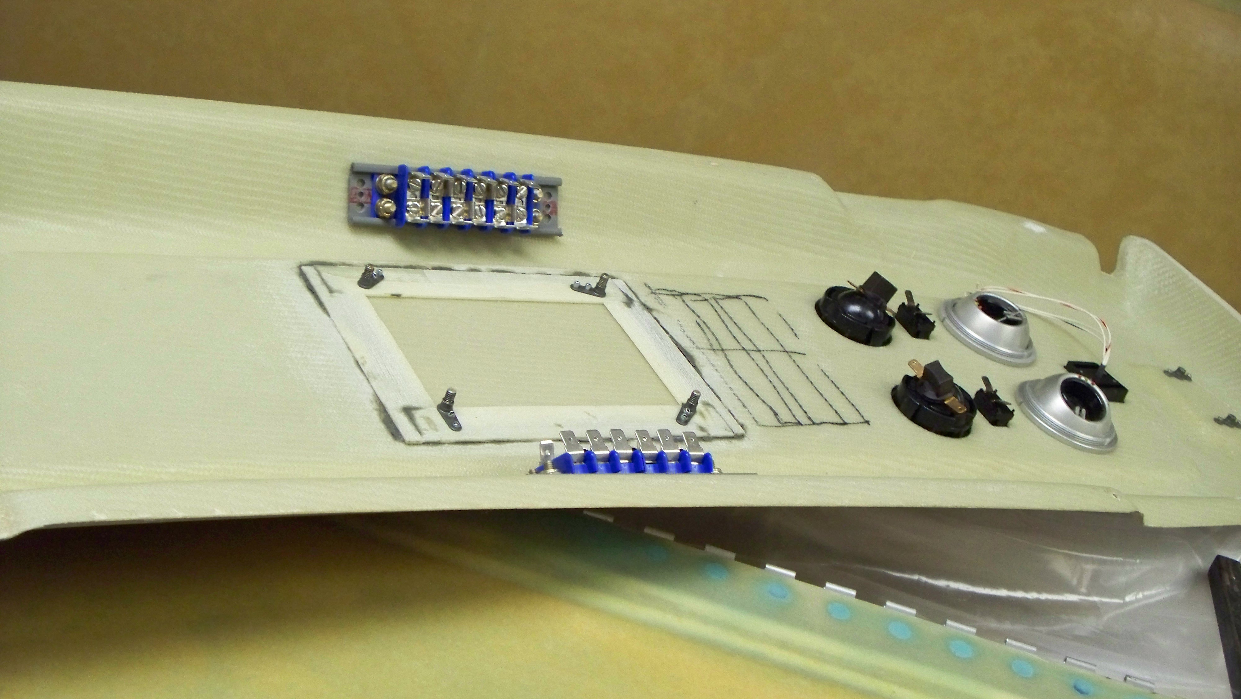 The three photos show the installation of the overhead lights along with the miniture switches. I removed the center light module from the mounting ring and mounted them directly into the console. A screwdriver can be used to pop the unit out for bulb replacement. This seemed like a more convienent mounting for my purposes. This put the rim of the lights and the rim of the switches on the same level. The plan is to put a burled wood (simulated) panel into the center of the console. The bottom photo shows the final light over the baggage area. |